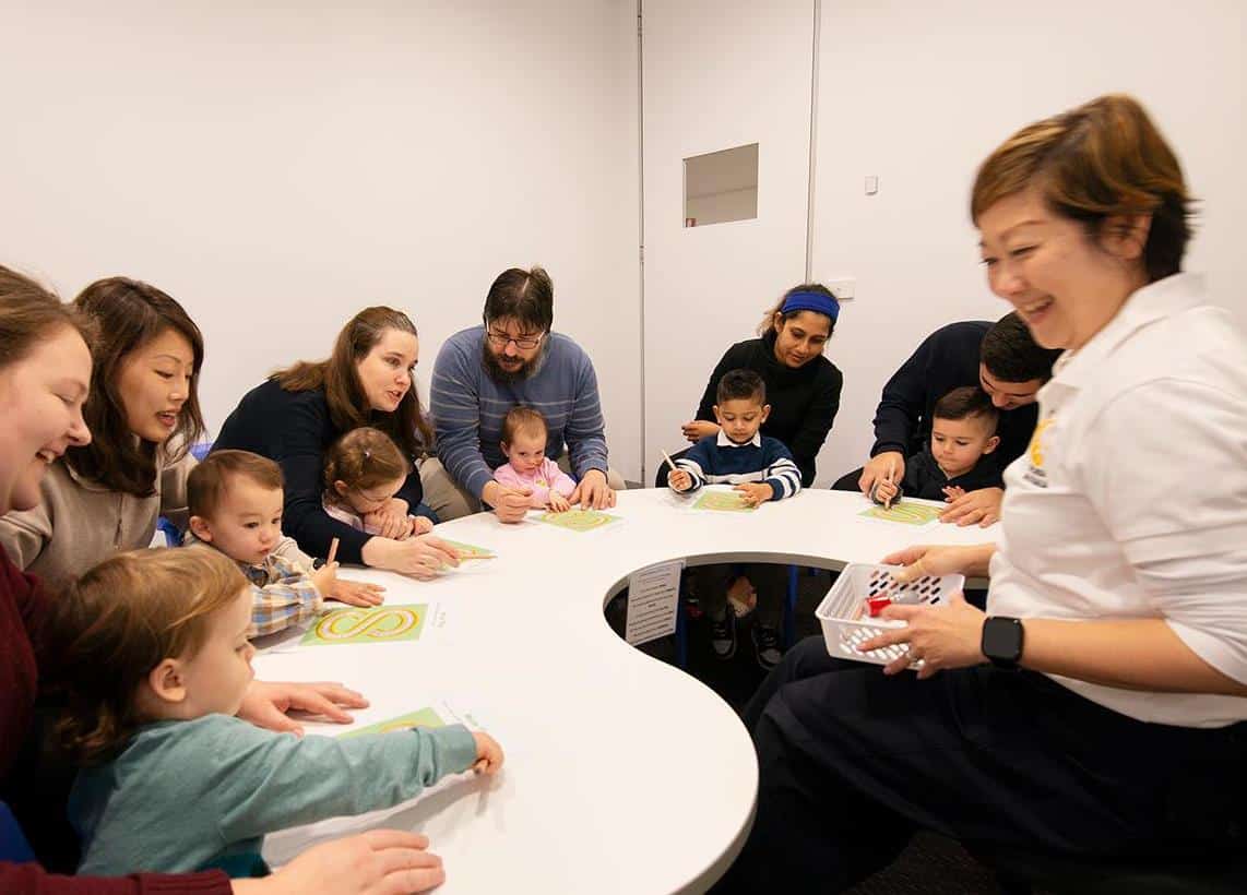 Photo from Shichida Australia: A certified Shichida instructor guides a toddler on how to cut a curved shape, during a fun Shichida class.